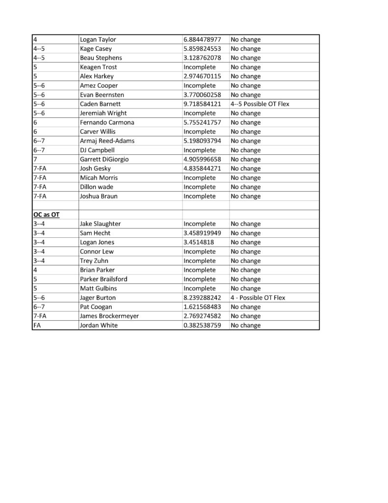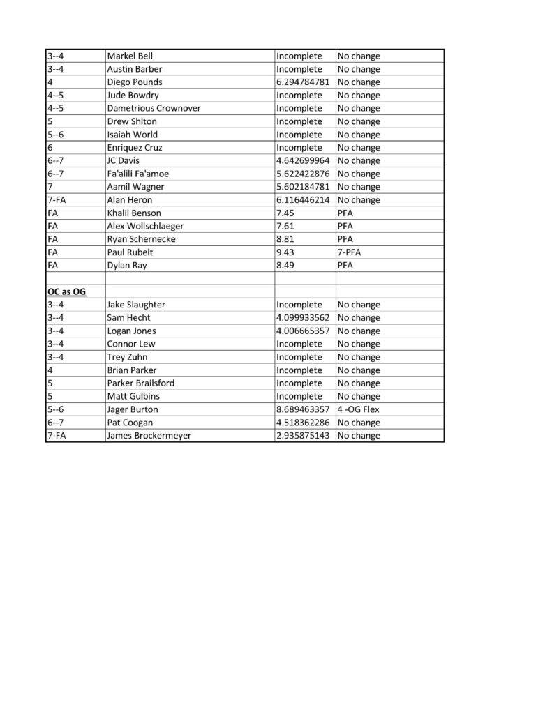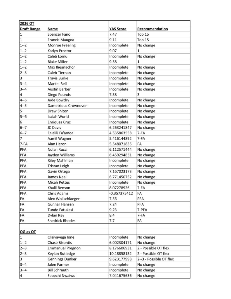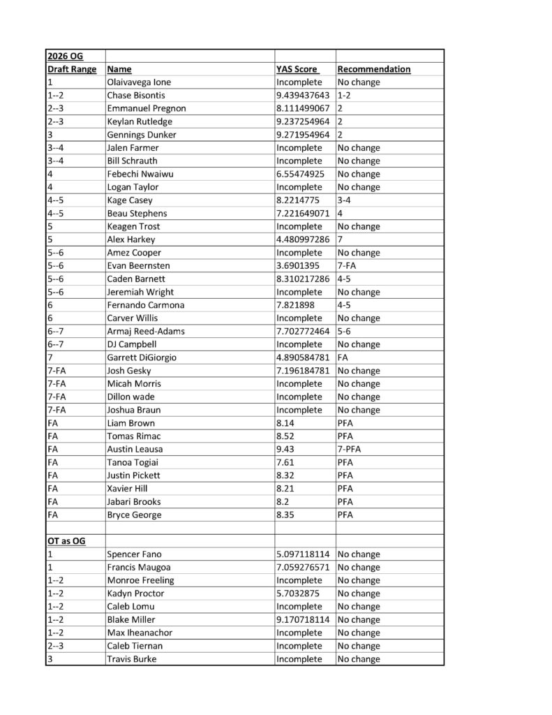 2026 OG By bevoe47April 12, 2026Uncategorized The good news is a lot of OG prospects have passing YAS scores (7.2 and above). The bad news is that there is an unusually low number of OT that can transition to OG.