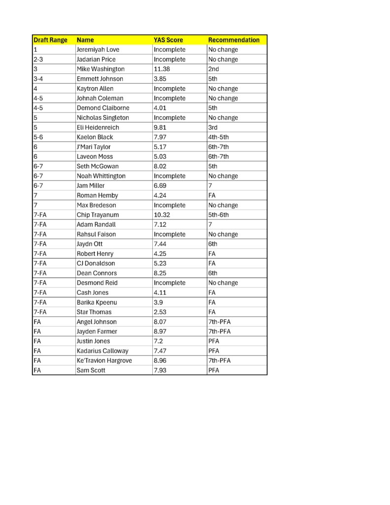 We have had to shift our RB algorithms because most of the RBs are no longer participating in enough drills to obtain a score using the earlier algorithm. Though this has a negative impact on the correlation maximization, we still account for different types of runners, pass blocking and receiving, with a robust overall correlation.