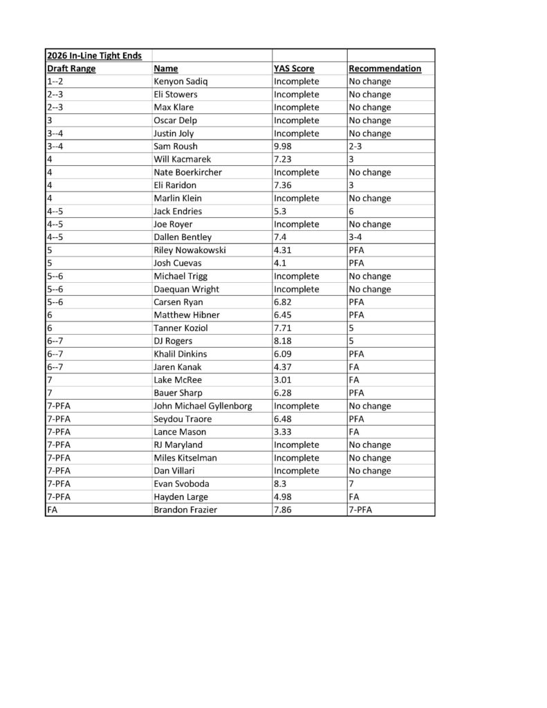 Again, the lack of participation by the top prospects took a lot of shine off of these scores. Even then, this appears to be a deep class where in-line TEs can be found throughout the draft. Our one big regret is that John Gyllenborg chose to pass on the 3C. Even an adequate time on the 3C would have yielded an interesting score.